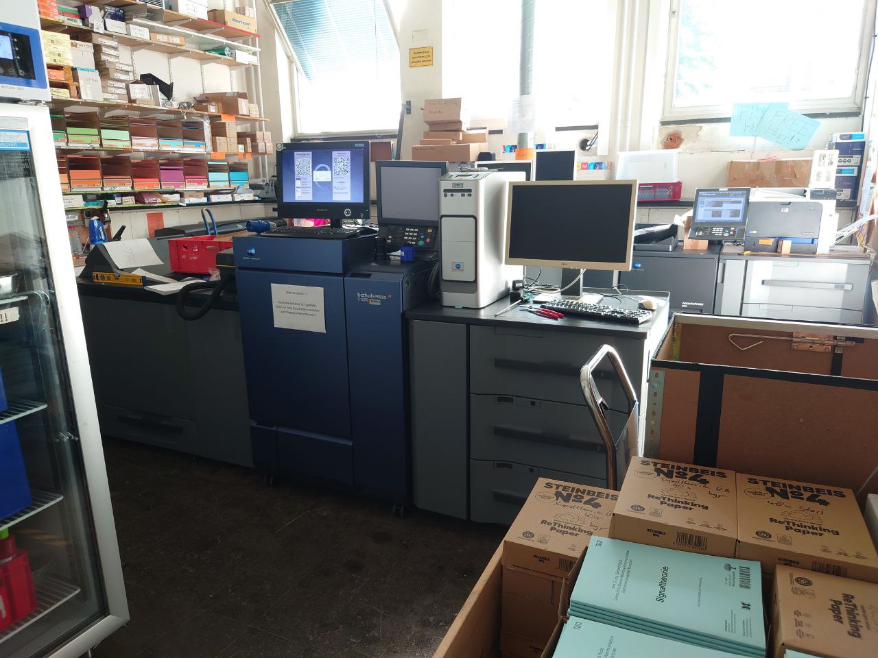 Das ist die Blackwidow, unsere Farbdruckmaschine. Wir haben sie 2012 hauptsächlich zum Druck farbiger Abschlussarbeiten angeschafft. Sie druckt bis zu 45 farbige Seiten pro Minute. Es handelt sich um eine bizhub C452 von Konica Minolta. Neben dem Druckwerk besitzt sie eine kleine Falz- und Hefteinheit.