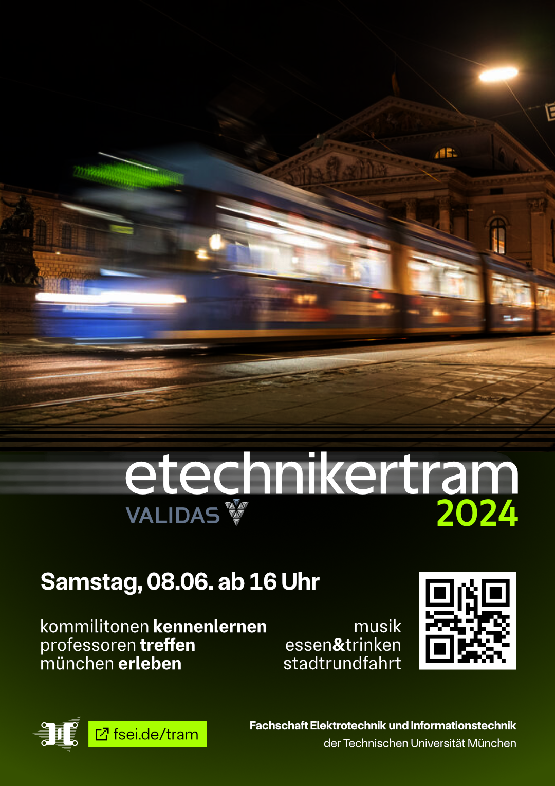 Als ein weiteres Highlight im Elektrotechniker-Party-Kalender findet ihr dieses Jahr die E-Techniker Tram. Die Fachschaft Elektronik und Informationstechnik veranstaltet diese für alle Studierenden der Elektrotechnik und Informationstechnik. Nach der allseits bekannten Erstsemester-Hütte ist das die nächste tolle Gelegenheit für Studienanfänger um Kommilitonen, Professoren und Zentralübungsleiter aus euren Semestern kennenzulernen.